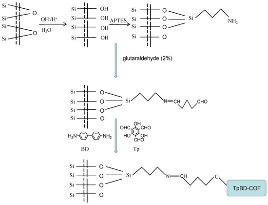 Construction and application of novel covalent organic frameworks (COFs) are one of the most efficient and promise methods to solve these problems due to their fascinating properties [13,14], such as rigid structures, high thermal stabilities, low densities and permanent porosity with specific surface areas [15,16]. However, there have been only a few papers on this topic so far [17,18,19,20]. Bao et al. [17] developed a multilayer COF-5-coated capillary by a polydopamine-supported method and layer-by-layer strategy, and applied it for separation of neutral, acidic and basic analytes, which demonstrated the great potential for COFs as stationary phases of OT–CEC for the first time. In contrast, a high stable immobilization of COFs on the inner wall of the capillary column is a challenge to carry out. On the one hand, the stationary phases obtained by the dynamic coating method through physical absorption are unstable and have a short lifespan [18]. On the other hand, the classical COFs, such as COF-1 and CTF-1, also cannot be at the stable stationary phase due to the lack of appropriate reactive groups [19]. Immobilization of COFs to the inner wall of the capillary by chemical bonding and in situ synthesis is attracting researchers’ attention [20]. The TpBD COF, synthesized from phloroglucinol (Tp) and benzidine (BD), has a large number of amino groups, which have the possibility to react with aldehyde groups by Schiff’s base reaction to form the stable stationary phase. By searching relevant publications over the past 15 years (2005–2021) using SciFinder, 17 results were found for “TpBD and chromatography”. Most of them were focused on GC [21], HPLC [22,23] and solid phase extraction [24,25].
