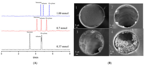 The dosage of the monomers is the most important factor during the OT column preparation. Effects of the dosages of 0.37, 0.70 and 1.00 mmol Tp with a 1:1.5 molar ratio mixture of Tp and BD on the separation of benzene, toluene and o-xylene were studied, as shown in Figure 2A. The migration times of the analytes increased with the increase in the Tp dosage. The analytes could be partly separated at 0.37 mmol of Tp due to fewer reaction sites from the stationary phase. Baseline separation was obtained at 0.70 mmol and 1.00 mmol of Tp; however, the migration times of the latter lengthened. Therefore, 0.70 mmol was chosen as the optimal dosage of Tp.