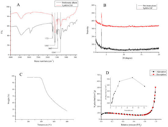 A stretching vibration band of 1721 cm−1 (C=O) showed the reaction of the aldehyde group with the hydroxyl group on the benzene ring. The appearance of the characteristic bands at 1595 cm−1, 1465 cm−1 (C=C), and 1281 cm−1 (C–N) indicated the existence of TpBD COF in the stationary phase (Figure 4A) [31]. Only one intense peak at 3.6° in XRD patterns showed that the moderate crystallinity of TpBD COF was observed in the stationary phase (Figure 4B). TGA analysis was performed under a nitrogen atmosphere at a heating rate of 10 °C·min−1 from room temperature to 800 °C. The stationary phase lost weight at around 410 °C, revealing good thermal stability (Figure 4C). Nitrogen adsorption–desorption isotherm in the stationary phase was measured at the temperature of liquid nitrogen (77 K). The surface area and the total pore volume were 524.38 m2·g−1 and 0.84 cm3·g−1, respectively. A typical type-IV isotherm with H3 hysteresis loops was observed, it was indicative for the stationary phase with mesopores structure, which was consistent with the pore size of 3.50–7.80 nm in Figure 4D. These results suggested that TpBD COF was modified to the inner wall of the capillary.