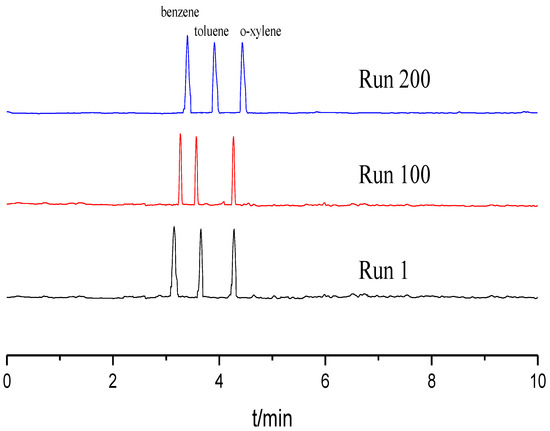 Separation chromatograms for benzene, toluene and o-xylene with different runs. Experimental conditions: sample, 5.0 mg/mL benzene; 5.0 mg/mL the mixture solution of benzene, toluene and o-xylene; 20 mM of phosphate buffer solution; operating voltage, 15 kV; temperature, 20 °C.