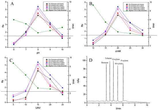 Effect of experimental conditions on the separation of the alkyl benzenes: (A) pH, (B) buffer concentration, (C) operating voltage and (D) separation chromatogram of the alkyl benzenes on the TpBD COF immobilized capillary. Experimental conditions: sample, 5.0 mg·mL−1 mixture solution of alkyl benzenes; temperature, 20 °C.