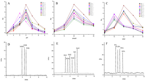 To further demonstrate the performance of the TpBD COF immobilized capillary, mixtures of neutral parabens (MHB, EHB and PHB), amphoteric sulfonamides (SM1, SDM, SM2, SMZ, SIZ and Esb3) and acidic benzoic acids (BA, FLBA, FBA and DPA) were analyzed (Table 3). The influence of pH and concentration of buffer solution and operating voltage on their separation were investigated (Figure 8A–C).