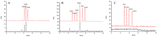 To validate the application of the method, the recoveries for the parabens, the sulfonamides or the benzoic acids were investigated by using the hand cream, the commercial sulfamethoxazole tablets or the drinking water samples spiked with their corresponding standard solutions at three different levels (1.0, 20.0 and 50.0 mg/mL). Sample solutions were prepared as described under section “Preparation of sample solution” and were analyzed in five replicates in the optimum CEC conditions (Table 5). The assay results showed that the average recoveries of all analytes were in the range 91.20–103.18% with RSD values below 1.24%. Contents of MHB (0.27 ± 0.03 %) and EHB (0.24 ± 0.04%) in the hand cream were obtained according to the linear equation, which met the Cosmetic Health Criterion requirements [38]. SMZ content (96.5 ± 2.25%) in the sulfamethoxazole tablets was agreed with that of the label claimed and also satisfied Chinese Pharmacopoeia (2020 edition) [38] and no benzoic acids were detected in the drinking water (Table 6). These results were in accordance with those of HPLC analysis [37,38,39], which indicated that the established method was accurate and reliable. The typical chromatograms for the samples before and after being spiked at 20.0 mg/mL were displayed in Figure 9A–C.