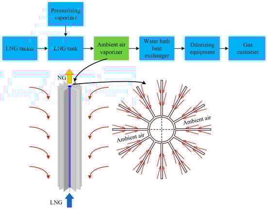 With corresponding energy conservation and emission reduction policies, natural gas has become more popular in the macrocosm. It is critical to choose the best regasification facilities because it has a huge impact on revenue over the entire operating period in the LNG system. The regasification facilities can be classified into several types according to the heat sources: open rack vaporizer (ORV) [1], ambient air vaporizer (AAV) [2,3], submerged combustion vaporizer (SCV) [4], and intermediate fluid vaporizer (IFV) [5,6]. These vaporizers have different characteristics, which means we can select the best one according to our needs and economic requirement when considering climatic conditions. One of the promising alternatives is the AAV where the heat resource stems from ambient air that needs no money. Neither will it make any cold contamination, such as the ORV killing marine life, nor will it produce industrial exhaust gas or the SCV contaminate ambient air. Thus, this kind of small-scale regasification application based on ambient air as the heat source is widely used in China nowadays.