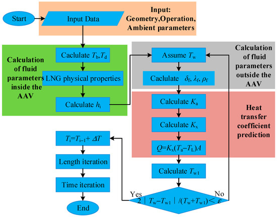 Considering the heat transfer of a single-finned tube, the influence of adjacent finned tubes on each other can be ignored. The temperature of ambient air and LNG were, respectively, 293.15 K and 111.15 K, and relative humidity was 50%. The LNG was composed of methane (90.68%), ethane (7.06%) and propane (2.26%). The capacity of AAV was 2000 , in which the operating pressure was 0.6 MPa. It had 10 tubes, and each tube had 48 m that could be added to 12 fins. The inner diameter of finned tube, , was 28 mm and outer, , was 32 mm. Each thickness of the fin was 4 mm, and the height was 80 mm. The coupled heat transfer from the air-side to LNG was performed in Visual Studio 2013 through Fortran, where the physical properties of LNG and NG was called by the REFPROP software. Figure 2 illustrates the flow chart of the calculation program for AAV.
