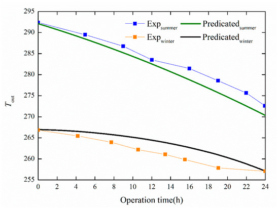 Keeping other conditions unchanged, we set the environmental conditions to be summer and winter. For summer, was 294 K, and the relative humidity φ was 0.7. For winter, was 267 K, and the relative humidity φ was 0.5. Figure 4 shows the comparison of predicted and the experimental data. It can be seen that the outlet temperature decreases with the increase of operating time. The test results are in good agreement with the experimental results. The root–mean–square errors in summer and winter were 2.06 K and 2.21 K, respectively. There is a key point that is worth noting: that the magnitudes were different in summer and winter. This is because of the greater influence of the quadratic of temperature on the radiation heat exchange coefficient. Furthermore, the extremely low ambient air temperature in winter causes the blocking effect of the frost crystal porous medium to be stronger. As a consequence, the predicted temperature at the outlet in summer was lower than the detection data, while in winter it was higher than the detection data. The experimental results are presented in ref. [39].