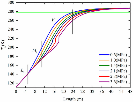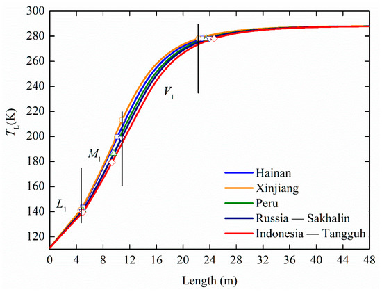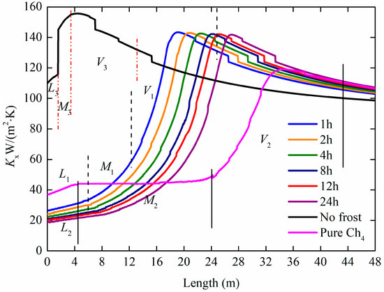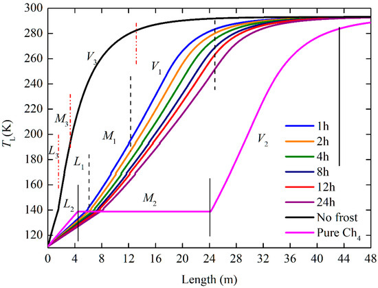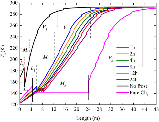 The process of heat transfer of LNG in a finned tube from bottom to top is affected by the phase change of water vapor on the surface of the finned tube as well. It is required that the temperature of outlet fluid is not less than that of the ambient 10 K to reach the export condition. , and represent the pure liquid phase; , and represent the mixed phase; and , and represent the pure-vapor phase. Except for pure , the rest curves are based on multi-component conditions. As can be seen from Figure 5, on the one hand, the total length of three phases in the no-frost condition is 13.7 m, which is less than 24.69 m of the multi-component fluid in the frost condition from the perspective of changing outside conditions of the finned tube. Thus, the thermal resistance of the frost layer deteriorates heat-transfer performance. On the other hand, the total length of three phases with multi-component fluid in AAV is 24.69 m, which is less than 42.93 m of a single component from the perspective of the changing internal fluid type variation. It can be detected that the mechanism of regasification is different between the two types of fluid. Moreover, the internal fluid temperature development in the mixed phase is different between the single-component and the multi-component type. The most different key point is that LNG rises from the bubble point ( = 140.75 K) to dew point ( = 196.15 K) in the mixed phase, but the pure could only keep a saturation temperature ( = 138.73 K) until the thermodynamic dryness degree was greater than 1.0. It can also be seen from six groups of data that the temperature of the multi-component fluid performed a parallel movement along the direction of AAV as time increased.