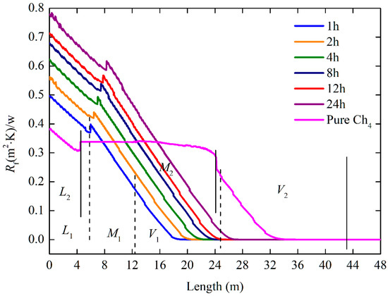 One of the direct effects of increasing frost deposition on the finned tube is that the thermal resistance changes correspondingly. Figure 8 shows the variation of thermal resistance along with the direction of the tube at different operation times. It can be detected that the thermal resistance of the frost layer keeps the same movement under the development of the frost layer no matter how the internal fluid is a single component or a multi-component. Thermal resistance deteriorates heat transfer with increasing operation time, and its maximum value occurs at the inlet is 0.78 in multi-component fluid during 24 h operation. At the same time, the pure liquid phase and mixed phase moved forward, and the pure-vapor phase moved backward a distance of 0.47 m. The continuous operation of AAV will inevitably increase the thermal resistance to make the outlet fluid temperature fail to meet the requirement. Therefore, once is lower than the required standard for export, it must be shut down and defrosted periodically.