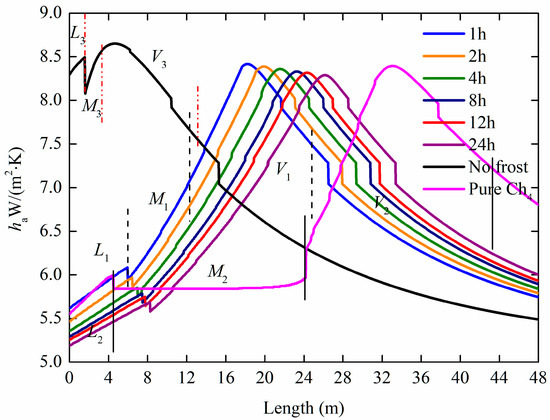 The overall convective heat transfer coefficient is one of the comprehensive standards for evaluating the heat-transfer performance of the AAV. On the one hand, the extreme phase change of the LNG inside the tube has a heavy impact on the overall heat transfer; on the other hand, it is also affected by the number and area of fins. As Figure 11 shows, in the pure liquid phase, under the no-frost condition can reach up to 115.71 , which is 3.5 times of 33.1 of frost condition under multi-component fluid, and 2.7 times of 43.5 of frost condition under single-component fluid. can reach up to 155.6 at the end of the mixed phase. While in frost condition, it decreases to 143.3 under the multi-component fluid and 119 under the single component. Compared with the no-frost condition, the frost deposition on the finned tube caused by the multi-component increased the designed length of the finned tube in AAV by 44.5%. Compared with the two types of fluid under frost conditions, the designed length of the finned in AAV was caused by the pure , which increased it up to 42.5%. Therefore, it can be concluded that the frost layer has a serious impact on the deterioration of its heat-transfer performance, and the designed length of the AAV can be shorter under the real LNG when the AAV is in operation.