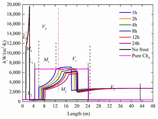 LNG phase changing can be affected by the energy transfer conservation of finned tube in the internal and external. Frost deposited on the finned tube affected the surface heat-transfer performance and then influenced the distribution of the temperature of the finned tube, and finally, it obstructed the temperature of the internal fluid. As Figure 10 illustrates, in the critical point of the mixed phase, it can be seen that the multi-component fluid under the no-frost condition can obviously reach up to 19,668 in the mixed phase, which is higher than 7000 of the same composition and section under the frost condition. By comparing under the two types of fluid in the mixed phase, the multi-component liquid had a significant rise from (3000–7000) and then held a stable value while the single-component liquid always held 7000 in the whole mixed phase. It can be analyzed that there is a different heat transfer mechanism between real LNG and pure fluid when LNG is vaporizing. Because the gradually increasing allows the light component to firstly escape from the mixture fluid for the first time, the proportion of components in the pure liquid phase then begins to change. Along with the increasing x and , the light component will escape from LNG accompanied by the heavier component as well. As x and continued increasing, the vaporizing rate of light component was greater than that of the heavier component until the whole fluid is vaporized and enters the pure-vapor phase. It is the reason why the complex heat transfer coefficient changed sharply in the mixed phase as well. At the same zone as pure fluid, the single component has one fixed saturation temperature that keeps stable when the thermodynamic dryness degree changes from 0 to 1.0.