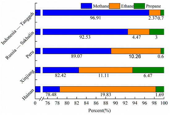 The above working condition compares the differences between pure methane and multi-component LNG at different operating times. The main reason for these two differences is due to the different phase change mechanisms in AAV. In order to study the different reasons, more comparisons between components were carried out. By introducing 5 LNG components from different regions and simplifying them, only the main components are retained for calculation. The main components of the five regions are shown in Figure 12, in which the data sources come from ref. [40].