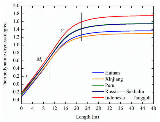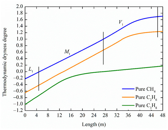We have already compared the temperature changes based on the multi-component and single component, only focusing on what caused the differences in the heat transfer mechanism of single component and multi-component inside the finned tube. For this reason, the thermodynamic dryness x in the tube was calculated. As shown in Figure 14 and Figure 15, the x can reflect the heat transfer characteristics of the LNG inside the finned tube. We compared the x of five components from different regions with that of methane, ethane and propane under the same working conditions. It was found that the slope of the pure component (0.085) was significantly lower than that under the multi-component condition (0.042) in the pure liquid phase and the mixed phase. The thermodynamic dryness degree of LNG varied with the composition when the dryness exceeded 1.0, which may be due to the different sequence of phase changes when the dryness reaches 1.0 within the multi-component. In the case of pure components, the heavier on the molar molecular weight is, the lower it is to the initial x, and the molar molecular weight of methane and ethane can exceed 1.0 with the length of the tube, while propane has completely failed to meet the export requirements.