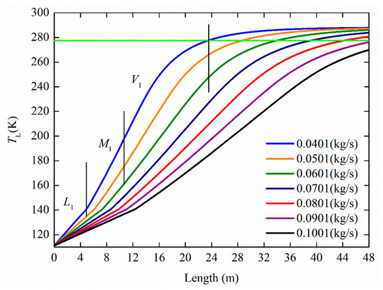 By setting to 288.15 K and the relative humidity to 0.56 for a one-hour simulation, it can be seen that the and positions of the multi-component LNG have not changed significantly from Figure 13, but it has a trend to shift to the right in the position where the LNG reaches the qualified export temperature. When the average increasing rate of methane content was 4.61% in the regions, the average deviation rate of the to the right was 2.46%, which shows that the heat transfer effect caused by changing the content of methane is very small for AAV, so the change of the content of methane in LNG has very limited effects on the operation of itself. Moreover, as the methane composition gradually rises, the temperature at the mixed phase zone in the finned tube does not rise first, but the more methane is in the composition, the more the phase change lags behind.