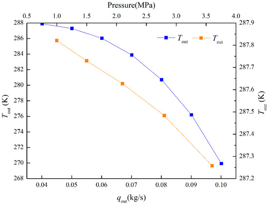 We collected the temperature at the outlet of the AAV under different flow rates. As Figure 18 illustrates, it is found that when the flow rate increasing rate was 0.01 , the average drop in was 2.99 K. Additionally, after the flow rate reached 0.0901 , the AAV had not reached the after the one-hour operation. It shows that the AAV with a fixed geometric size has a certain limit value in the flow rate. When the flow rate exceeds a certain limit, the gasification is incomplete and does not meet its operational requirements. However, the situation is different when the pressure is changed. It can be seen from Figure 18 that when the acceleration value of the pressure increase was 0.1 MPa, the average rate of drop of the AAV was only 0.125 K. By comparing both situations, we can conclude that the influence of increasing the flow rate on the is significantly greater than that of increasing the design pressure inside the AAV.