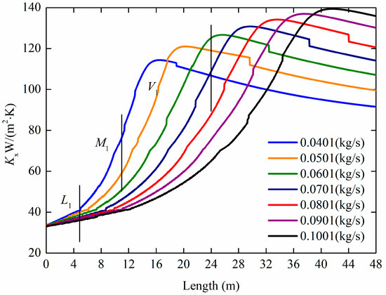 Different from the LNG temperature, the peak heat transfer coefficient of the AAV will increase as the flow rate increases. With an average increase of 498.27 in flow rate, the peak heat transfer coefficient increased by 4.17 on average, and the average relative position lagged by 4.2 m. This is because the increase in the flow rate leads to a greater demand for heat transfer per unit area. Although there is a “translation” performance in the tube length, it is still inevitable and will still reach the maximum value at a certain position. Correspondingly, when the acceleration of the design pressure increase was 0.1 MPa, the average peak heat transfer coefficient increased by 0.71 , and the average relative position lagged by 1.2 m. It can be seen that changing in the peak value and position of the total heat transfer coefficient caused by the varying in the flow rate was greater than the influence of the pressure on it.