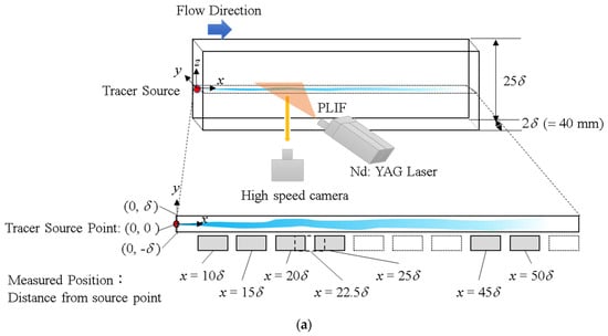 As mentioned earlier, from the point source to a medium distance, the concentration mass was distributed not uniformly over the entire channel, resulting in macroscopic concentration non-uniformity. To identify the range of source distance where this non-uniformity affects the accuracy of determination, the distance that the dye flows from the channel center to spread over the entire channel was estimated. The spanwise wavelength of large-scale structures in the channel turbulence is 1.3δ–1.6δ [30], and it is assumed that the dye in the channel center is directed toward the wall vicinity, owing to the vortices related to this large-scale structure and the smaller-scale vortices. Assuming that the advection velocity from the channel center to the wall vicinity is about the same as wall-normal velocity fluctuation, v’, the arrival time from the channel center to the wall surface, th, is