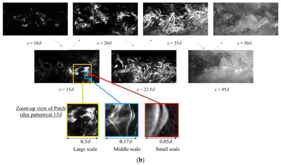Figure 1 also displays a sample of an original PLIF image. To make it easier to see, the brightness is uniformly increased by 80%. The white color in the image represents the fluorescent dye, which is visibly thinned as it spreads and diffuses with advection. It is noted that the PLIF image is not unlike the gas cloud image that is taken by an infrared camera over the leaked gas region [8] since the PLIF method provides a 2D image at a section plan. As can be seen from the images, the PLIF approach extracts some coherence inside the dye plume, which seems to have a dependence on the advect distance. A key characteristic of turbulence is the mixture of fluid motions (vortices) of various large and small length scales. An example is shown in Figure 1b, where a relatively large dye pattern generated by turbulent diffusion from the point source is confirmed to present a hierarchical structure of smaller scale dye patterns (i.e., patches). Such PLIF images are considered suitable for the first test case of applying CNN to learn turbulent mass diffusion.