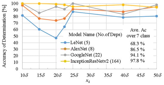 Figure 2 shows the accuracy of determination, Ac, for the seven classes (10δ, 15δ, 20δ, 22.5δ, 25δ, 45δ, and 50δ) of W0.9δ. The prediction accuracy of each distance was different, as described later. However, when focusing on the overall prediction accuracy, the model generally demonstrated high prediction accuracy regardless of xd. Figure 2 also shows the average prediction accuracy and the network depth. All models except LeNet had an accuracy of 75% or greater, indicating successful source-distance estimation by the deep CNN. Additionally, GoogLeNet and Inception-ResNet-v2 had an accuracy of 90% or greater. Thus, it can be confirmed that the deeper the network, the higher the accuracy. Regarding learning time, GoogLeNet learned 4–6 times faster than Inception-ResNet-v2 under the same GPU environment (NVIDIA Tesla V100). LeNet and AlexNet, both with fewer layers, are even faster than GoogleNet, but their inference accuracy depends strongly on the number of layers. The increase in the number of layers from 5 to 8 increases the inference accuracy from 68% to 87%. In contrast, the difference between GoogleNet and InceptionResNet-v2 is only a few percent. One may be satisfied with the 22-layer GoogLeNet, which can achieve an accuracy of over 90% in moderate computational time, and higher layer numbers tend to make inference accuracy difficult to improve.