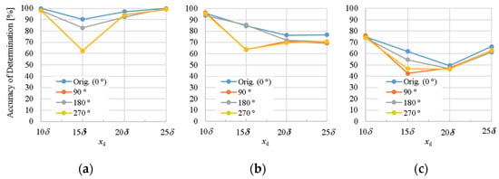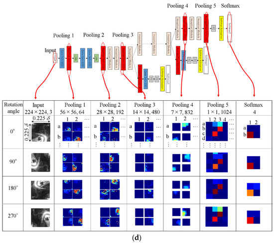 Additionally, the turbulence intensity in the channel displayed anisotropy; to confirm the geometric (rotational) change effects on the source estimation, the original image was set to 0°, and four rotated images of 0°, 90°, 180°, and 270° clockwise were input to a CNN that was trained by the 0° images as the training data. As for three target cases of W0.9δ, W0.225δ, and W0.05δ, four-class (10δ, 15δ, 20δ, and 25δ) classification was conducted for each case. The result of the accuracy of determination, Ac, for each source distance is shown in Figure 3a–c. For all image sizes, the decrease in Ac for 90° and 270° was about 20% for xd = 15δ and within 10% for the other xd, compared with 0° and 180°. This result shows the robustness to geometrical (rotational) changes. In order to visualize how the image pattern was recognized by the CNN, a part of the feature map of the pooling layer per each rotation image is shown in Figure 3d. This feature map was based on the correct answer verification image of xd = 20δ for W0.225δ. For the first pooling layer (“Pooling 1” in Figure 3d), an image having a window size of 0.225δ was entered as an input with a data size of 224 × 224 × 3 channels, becoming 54 × 54 × 64 channels with a 3 × 3 filter in “Pooling 1.” Some results of four filters at this pooling layer were displayed as images at the same position and labelled as a-1 and a-2 for all rotated images. From these images of “Pooling 1”, it can be seen that the same filter extracted nearly the same features regardless of rotation. The same tendency can be confirmed in the deeper layers; thus, the deeper the layers, the more relaxed the positional relationship of the reaction. At the final softmax, the estimation was successful because all the feature maps show the same distribution for all rotation cases. The red-highlighted panel at b-1 in the softmax image in the figure was the correct answer, and the redder the value, the higher the classification accuracy.