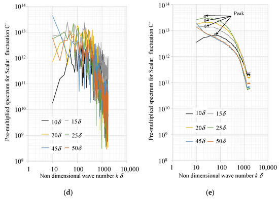 Figure 6a shows the 2D PSD results for W0.9δ, which is the largest image size. In addition to the arbitrarily chosen instant images and their analytic results, the ensemble-averaged spectra are also shown. The top images are samples for input data; each lower figure shows the 2D spectrum of each input image, and the right figure is an ensemble-averaged 2D spectrum. All shown input images are typical images that can be estimated for each source distance accurately by the trained CNN in the case of W0.9δ. Figure 6b,c show the one-dimensional PSD on the line (kx = ky) tilted 45° from the origin of (kx, ky) = (0, 0), marked with a red line in the images of (a) from each input image. However, no clear characteristic peak is found other than that at the origin. When statistically processed, the spectrum becomes gradual, and the scalar fluctuation energy decreases continuously at each scale, and any characteristic wave number cannot be confirmed, such as the spectra of the instant images. Figure 6d,e show the pre-multiplied spectra on the same straight line as the one shown in Figure 6a. As with the PSD, no clear peaks can be seen in the instant images. When the ensemble average was used, the peak wavenumber was confirmed to be within 10δ–25δ. However, this is the peak that appeared using the ensemble average; hence, the clear peak wavenumber could not be detected in the instant images (Figure 6a). We can conclude that, in contrast to the conventional feature extraction (i.e., PSD analysis), which requires time statistics, the CNN has an advantage of estimating the distance from ‘instantaneous’ information.