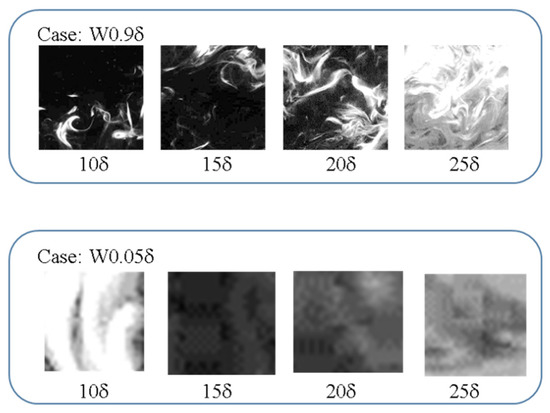 Firstly, we consider the situation that the camera distance from the measurement plane differs between training and testing, as shown in Figure 7. The influence of incorrect window size, i.e., incorrect camera distance, on the prediction accuracy was evaluated for two situations. As one of the situations where the test image whose window size is larger than that of training images, the W0.05δ learner was ‘incorrectly’ applied for the W0.9δ image input. As for the other situation, the W0.9δ learner was chosen to test a smaller window size (W0.05δ) than the image size assumed by the learner. Sample images for W0.05δ and W0.9δ at several xd are shown in Figure 8. Since the dye was not sufficiently diffused at 10δ, a clear dye pattern can be captured even within the window size of W0.05δ. On the other hand, the dye is more spread by turbulent mixing at 20δ and 25δ, which causes difficulty in capturing a clear dye pattern within the small window size of W0.05δ. It means that almost uniform dye might cover the whole W0.05δ window size. When an image of W0.9δ is used for test input image of the learner created by W0.05δ, the input image which contains clear dye shading is recognized as “not diffusing well” and the source distance, xd, is underestimated. In fact, when the test images of W0.9δ are used as the input images for the W0.05δ learner, they are inferred to be 10δ at all positions, as shown in Figure 9a. This must be the same as scaling down in the representative length of turbulence (i.e., image window size in this study) and using a pseudo low-Re image as an input. Similarly, when an image with W0.05δ is input to a learner trained with W0.9δ, it is considered to have a higher Re than the actual image and is resulting in an overestimated xd, as shown in Figure 9b.