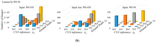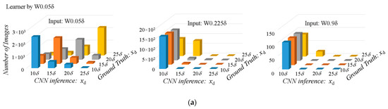 The k-fold cross validation was performed to confirm the effect of the combination of trained images on inference accuracy. The network used GoogLeNet and targeted W0.9δ for the five-class classification problem. The 14,000-image data were divided into 3500 × 4 images without duplication (see Figure A7a); one was used for validation and the other for training. A learner was created as a classification problem of four classes: 10δ (200 mm), 15δ (300 mm), 20δ (400 mm), and 25δ (500 mm). The inference result is shown in Figure A7b. From this figure, it is confirmed that the accuracy at each position was less biased by the training data, and the training image had sufficient generalization.