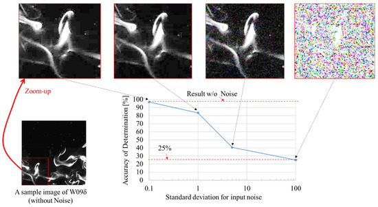 Next, we discuss the effect of the difference in the image quality (in terms of noise and image compression) between the training and testing images. We add Gaussian noise to some images to check the robustness against random noise, as the same approach in the literature [33,34]. This noise addition does not affect the white pixel with the maximum luminance, while the originally black pixel would be affected significantly. The accuracy of determination averaged over the four classes for the learner trained by W0.9δ was plotted with the different noise intensity, as shown in Figure 10. The Gaussian noise input, whose mean value is 0, with a standard deviation of 1.0 for the luminance of image degraded the accuracy by 10%. More specifically, there was a significant decrease in inference accuracy, especially upstream, such as xd = 10δ and 15δ, with little effect on the downstream side (figure not shown). This may be because a small amount of noise introduced “pseudo dye patches” into the non-distributed area, which is a characteristic of the upstream image. Since the dye diffusion has not yet progressed in the relatively upstream area immediately after the diffusion source, the distribution of the dye is clearly divided into black and white (with less gray regions), and the dye-absent area tends to be completely black with zero luminance. This feature was impaired by noise, which led to a decrease in the inference accuracy on the upstream side. The Gaussian noise with a standard deviation of 0.1 might be acceptable for this feature. On the other hand, when stronger noise with a standard deviation of 5.0 was added, the inference accuracy on the downstream side as well as the upstream side dropped significantly. As a result, the overall inference accuracy decreased down to 41%. On the downstream side, which was more robust to a weak noise, the image was generally more luminous, but the dye patches exhibited a fine filament-like pattern. This feature was lost by the strong noise and caused the inference accuracy to decline. Both inaccuracies were due to the loss of features in the distribution of the dye patches. Results with a standard deviation of 100 are interesting as well. Note that the inferential accuracy value is 25%, but it was validated on a four-class classification problem. This means that the inference of the learner did not work at all. For all noise-added images, the learner trained on noiseless images produced an output of xd = 10δ. In fact, the input image with a standard deviation of 100 would rather appear to anyone as a white image (see the rightest image in Figure 10). Such an extensive whitening feature seen in this image is observed upstream near the diffuse source. Therefore, the prediction mistake is a rather reasonable result for the trained learner.