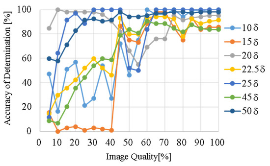 To confirm the effect of the number of trained images on inference accuracy, we change the number of training images for W0.9δ from 18,368 (100% as shown in Table 1), down to 50% of those images (9184), or 25% (4592), for comparison. The results are shown in Figure A1. The determination accuracy tended to improve as the number of training images increased, and it can be seen that the number of images used in this study (Table 1) had an accuracy of >80% at all points; hence, sufficient learning was achieved.