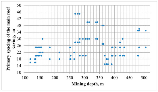 To perform the first task, the boundaries of the primary spacing of the main roof caving were outlined. This was carried out by means of a statistical analysis based on the practices of Western Donbas stopes (Figure 2).