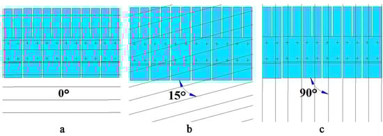 Direction of seam mining and support unit displacement relative to a system of natural fissility in the roof rock layers: (a) 0°, (b) 15° and (c) 90°.