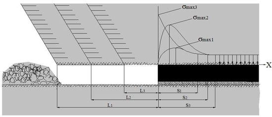 Scheme of explanation of the effect of shearer’s cutting width concerning the rock pressure distribution: L1, L2, L3—width of the zone of supported near-face space; S1, S2, S3—width of the zone of support pressure depending on Ln; σmax1, σmax2, σmax3—maximum value of stresses of the zone of support pressure depending on Ln.