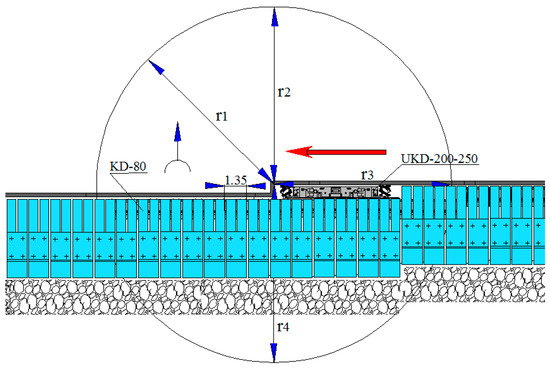 According to the available data, a zone of coal extraction by shearers in the Donbas mines experience its expansion towards a zone of front support pressure before a shearer r1, behind a shearer r3, onto the rock mass r2, and into the mined-out space r4. In this context, r1 ≅ r2 ≅ r3 ≅ 10–12 m. The interruption of a coal extraction process in the longwall results in the relative stabilization of pressure redistribution. Rock deformations during this period continue; however, their velocity decreases (Figure 8) [34].