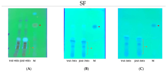 In TLC analysis of SF, there were no significant differences in YSF and JiSF, and it was revealed that SF extracts contained small amount of maackiain (Figure 1A–C). As the ethanol concentration decreased, polar components with low Rf values decreased due to the solvent polarity, as shown in Figure 1A–C with orange arrows. Interestingly, YSF-95Et and JiSF-95Et showed a distinct non-polar spot at the upper position of maackiain, which was not found in 70Et and 50Et.