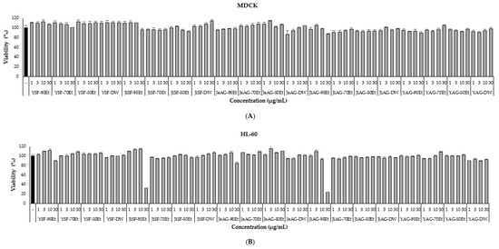 The cells, MDCK, HL60, and SH-SY5Y, were cultured in RPMI 1640, MEM, or DMEM, respectively, supplemented with 10% FBS, 100 units/mL penicillin/streptomycin solution, and 2-ME (50 μM), in a humidified atmosphere at 37 °C with 5% CO2. The cell viability was determined by CCK-8 assay [41]. Briefly, MDCK (1 × 104), HL-60 (5 × 104), and SH-SY5Y (5 × 104) cells were seeded in 96 well plates, and then 1, 3, 10, and 30 μg/mL of the extract were added to the wells. The plate was then incubated for 24 h at 37 °C with 5% CO2. After that, 10 μL of CCK-8 solution was added to the wells and the cells were incubated for 3 h further. The absorbance was detected at 450 nm with a Micro Plate Reader (VersaMax, Molecular Devices, Sunnyvale, CA, USA). The cell viability was expressed as a percentage of the control culture.