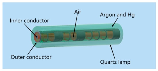 The use of microwave-driven electrodeless UV lamps, which have significant advantages in sewage treatment, has been proposed. These lamps have a long life, high power, and high efficiency. Additionally, there are no complications in lamp shape and no variations in light intensity (the light output is stable), indicating that rapid and complete sterilization can be achieved [,,,]. The initial microwave-driven electrodeless UV lamp lies inside the waveguide. This structure can be regarded as a microwave radiator that excites plasma to emit UV light. Due to the work of the waveguide requiring an anhydrous environment, the waveguide is surrounded by a quartz column to make sure that the entire structure represents a sealed environment for underwater sterilization [,]. Horikoshi et al. proposed a structure in which microwave radiation is used as a heat source, and UV and microwave radiation are available simultaneously [].