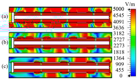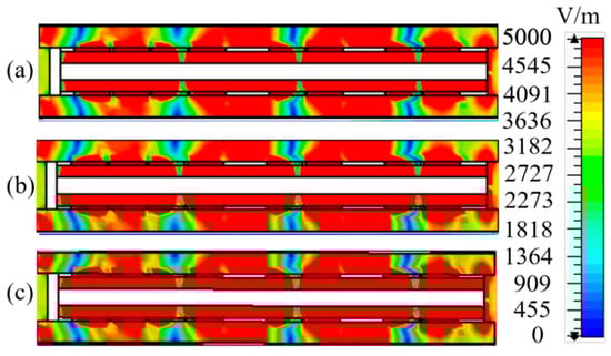 Electric field distributions with different number of slots: (a) 8, (b) 5, and (c) 3.