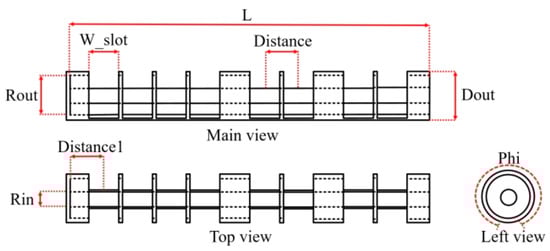 As shown in Figure 1, the system used in this study is based on a coaxial slot waveguide. We calculated the model with three, five, and eight slots, respectively. The electric field distribution of the structure is the most uniform when the number of slots is eight, as shown in Figure 2. There are eight slots around the coaxial waveguide, and a hollow ring quartz tube is sleeved outside the coaxial radiator. The quartz tube is covered with metal mesh, not depicted in Figure 1, to prevent electromagnetic waves from leaking, and the tube is mainly filled with argon and liquid Hg. Electromagnetic waves are coupled in open slots in the coaxial waveguide to excite the plasma lamp. A 2D top view, side view, and cross section of the structure are illustrated by Figure 3.