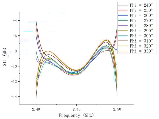 As shown in Figure 6, the effect of the angle on S11 was analyzed after the widths of the slots were determined. There were ten datasets to satisfy the requirements of S11 at 2.45 GHz. The energies coupled in different central angles were compared and it was determined that the best value for phi was 310°. Thus, phi was set as 310° in the subsequent calculations.
