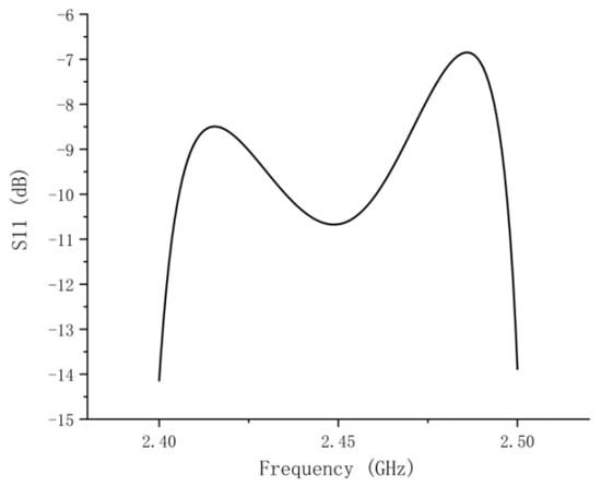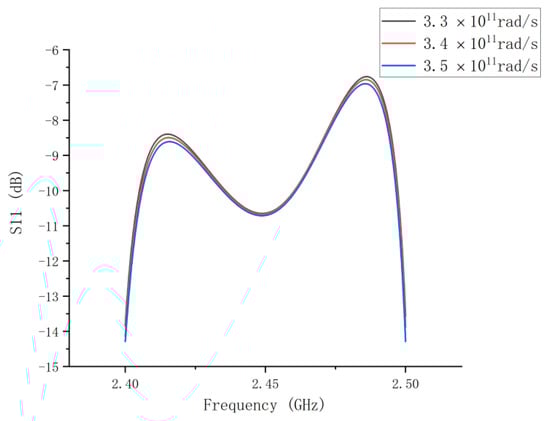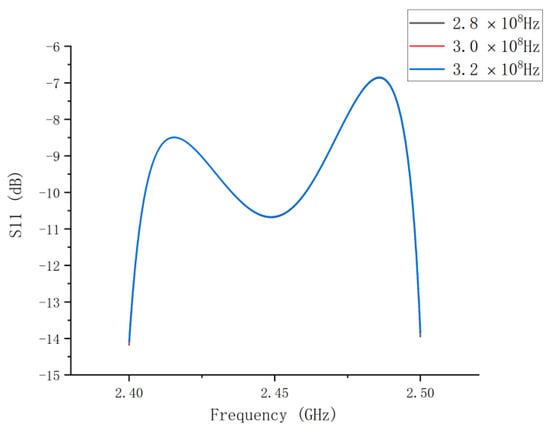 S11 exhibits almost the same trend in each case as shown in Figure 12. The values of S11 were all less than −10 dB at 2.45 GHz. When the plasma collision frequency changed, the power absorption did not deteriorate. One reason is that the change in plasma collision frequency influences both the imaginary and real parts of the relative dielectric constant, ultimately resulting in no significant change in the loss tangent. Consequently, S11 does not deteriorate. Another reason is that we completed the plasma frequency sensitivity analysis, demonstrating that the designed structure can be applied to various lamps. Figure 11 shows that the designed system can be used on a UV lamp with frequencies of 2.8 × 108, 3.0 × 108, and 3.2 × 108 Hz.