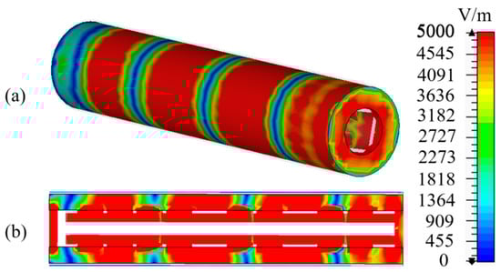 After sizing the model, we calculate the electric field strength and electric field distribution using the FDTD algorithm. Figure 8a shows the three-dimensional electric field distribution, and the two-dimensional electric field distribution cut along the coaxial radiator is shown in Figure 8b, where the maximum value is set to 5000 V/m. The covariance (COV) of the electric field strength is introduced to describe the uniformity of the electric field, and the COV can be expressed by Equation (9):
