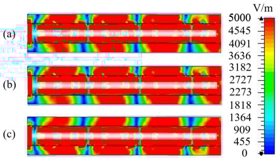 The plasma frequency was assumed to be 3.4 × 1011 rad/s, and the collision frequency values of the plasma were set as 2.8 × 108, 3.0 × 108, and 3.2 × 108 Hz. The electric field distributions for different plasma collision frequencies are shown in Figure 11. When the plasma collision frequency changed, mainly because of the variation in the relative permittivity, the electric field distribution exhibited a slight change, and the maximum and average values of the electric field are shown in Table 4. The electric field is periodically distributed in the axial direction. In the radial direction, the electric field distribution is also close to uniform.