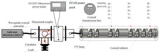 The overall diagram of the experimental system is shown in Figure 13. The main function of the solid-state source is to generate microwaves with a maximum output power of 1 kW. The circulator is a device that transmits electromagnetic waves in a one-way ring shape. This device helps protect the expensive microwave generator. The EIT UV power puck is a device that can measure UV power. Three test points are selected in the tangential direction of the lamp, the power is measured by changing the distance between the test point and the lamp, and finally the average value is taken and marked in Table 5. Sterilization can be achieved when the UV light energy is greater than 30 . Energy can be calculated by , where is the power, and is the time. From Table 5, it is found that sterilization can be complete within 10 s at a position within 15 cm of the UV lamp. As the distance becomes longer, the time required for sterilization increases.