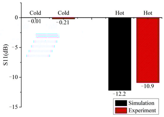 The light from the lamp is uniform and stable, as shown in Figure 14. In the hot state, S11 reached −12.2 dB in simulation and −10.9 dB in the experiment. The power efficiency was up to 91.8% in experiment. The comparison results for S11 under hot and cold conditions are shown in Figure 15. The experimental and simulation results were consistent.