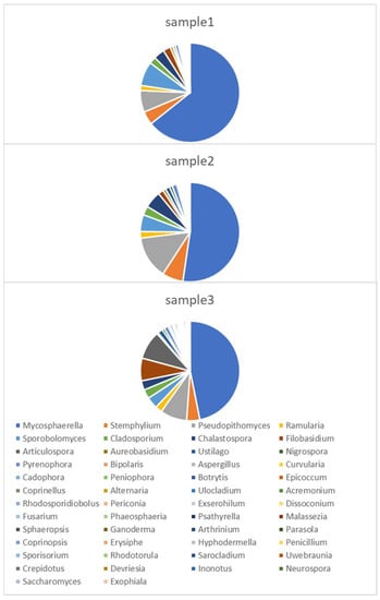 The fungal communities associated with grapevine were investigated twenty days before harvest, ten days before and at the harvest time. The number of used reads ranged from 41,822 to 116,524. Overall, the fungal populations at a phylum level were very similar and mainly comprised Ascomycota (62.7%) followed by Basidiomycota [3,20,21]. Phyla as Mucoromicota and Chytridiomycota had an extremely low abundance.