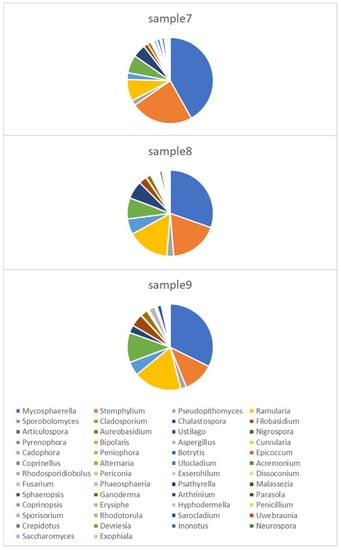 The top ten of fungal genera, found in all samples were Mycosphaerella, Stemphylium Pseudophytomyces, Ramularia, Sporobolomyces, Cladosporium, Chalastospora, Filobasidium, Articulospora and Aureobasidium.