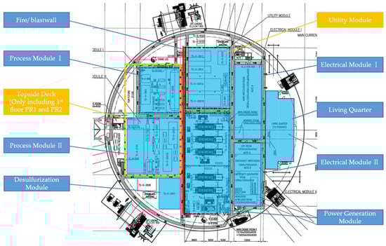 The LH11-1 FPSO is mainly responsible for the processing, storage, and offloading of process oil from existing and newly developed oilfields. This system includes a series of oil and gas processing units, which are shown in Table 1. Moreover, this geometry model for LH11-1 FPSO was constructed according to the information regarding the conversion from a 3D model and layout arrangements. The general layout of LH11-1 FPSO is presented in Figure 1.