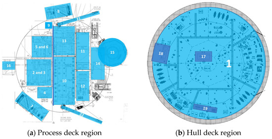 Regions defined for probabilistic explosion and fire analysis. (a) shows the process deck region with process module and deck, offloading starboard and portside, firewall, power-generation module, electrical module, utility module, living quarter, helideck, base of flare tower, crane portside and starboard; (b) shows the hull deck region with closed drain area, flare KO drum area and risers.