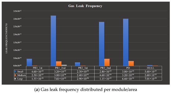 According to the engineering diagrams of the FPSO system, a detailed part counting of all oil and gas carrying equipment (valves, flanges, vessels, pumps, etc.) was performed. Referring to the above-defined target regions, the calculation of the leak frequency was conducted segment-by-segment and sub-segment-by-sub-segment. The results from the parts counting were processed to calculate the leak frequency based on the amount of equipment for each sub-segment by using the software DNV GL LEAK, which applied the Hydrocarbons Release Database (HRDB) 2006–2015 version created based on the leak statistics of offshore installations. By the leak frequency calculation, the main leak accident was selected and determined, which is shown in Figure 7.