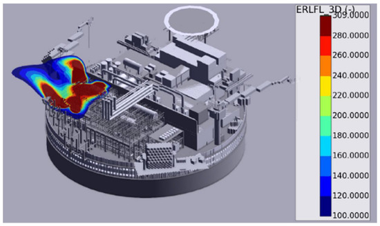Figure 10 displays the dispersion simulation result of a leakage gas cloud under dispersion case 661124. This result demonstrates that the gas cloud is mainly distributed in PR1_1st deck, PR1_2nd deck, and the firewall, especially in the process module region, where there is a large number of Q9 gas clouds. This gas cloud would gradually extend to offloading portside and the utility module due to the influence of the east wind. Simultaneously, Table 3 demonstrates that this case would produce the maximum Q9 gas cloud volume of 601 m3, which was caused by the combined effect of downwards leakage and wind east direction. Looking at the leakage gas cloud under case 661,117, from Figure 11, it can be seen that this leakage gas cloud was mainly distributed in PR1_1st deck and PR1_2nd deck. Table 3 demonstrates that the Q9 gas cloud volume was 206 m3.