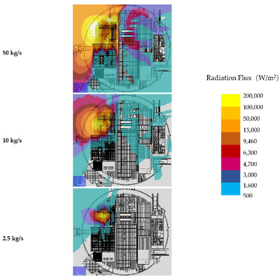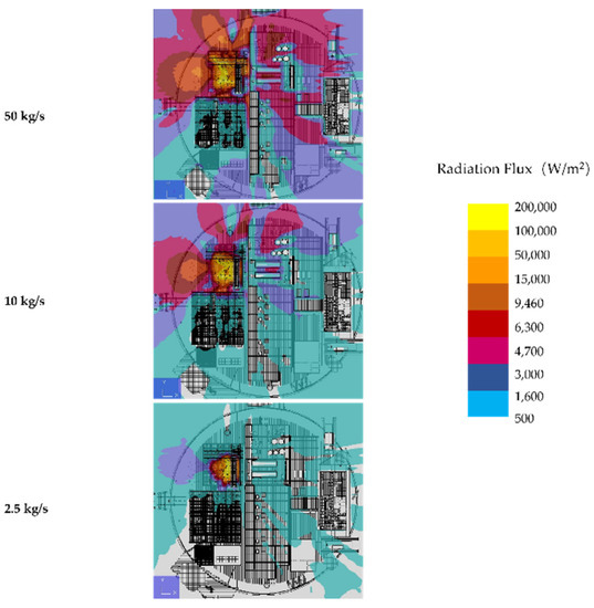 Figure 13, Figure 14 and Figure 15 display the radiation flux of jet fire of process deck first floor, jet fire of process deck second floor, and pool fire of process deck second floor under different flammable gas leak rates. Therein, the larger leak rate would induce more severe fire heat radiation flux, especially under the leakage rate of 50 kg/s, when the ambient radiation flux of the jet could reach the range of 5 × 104 to 2 × 105 W/m2, and that of the pool fire could reach the range of 3 × 103 to 1.5 × 104 W/m2. Moreover, comparing Figure 13 and Figure 14, we could find that the process deck second floor would suffer more heat radiation than the process deck first floor. At the same time, the radiation flux of pool fires is much smaller than that of jet fires.